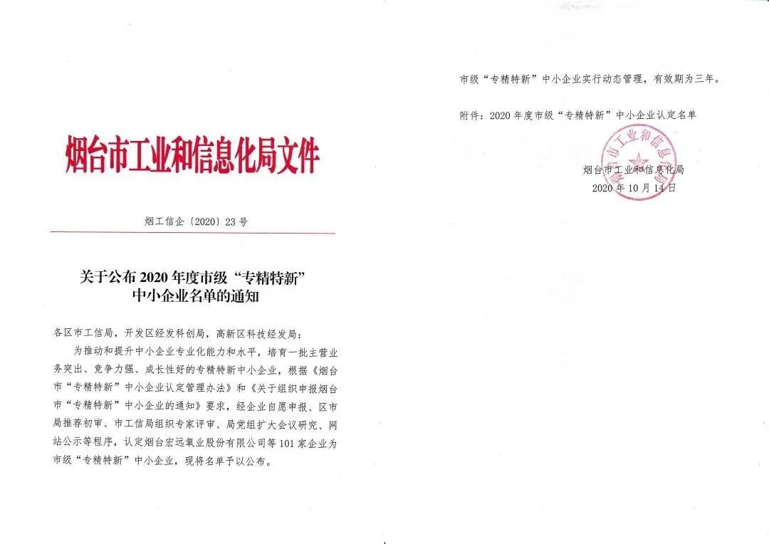 2020年10月14日,根據(jù)煙臺市工業(yè)和信息化局《關(guān)于組織申報(bào)煙臺市“專精特新”中小企業(yè)的通知》,經(jīng)縣市區(qū)推薦及專家評審,煙臺巨先藥業(yè)有公司繼2017年被評為市級“專精特新”中小企業(yè)后,再次獲得此項(xiàng)榮譽(yù)稱號。